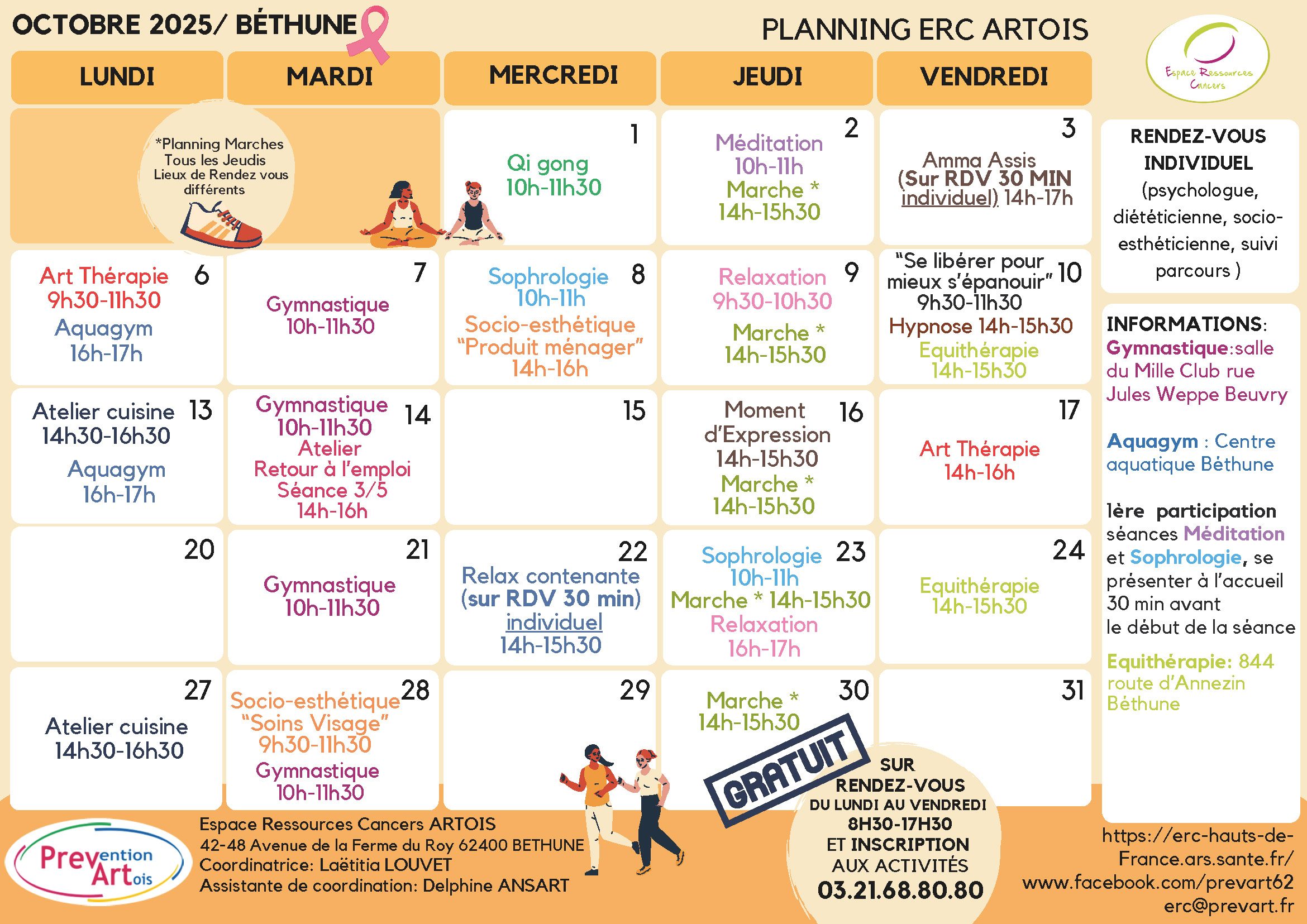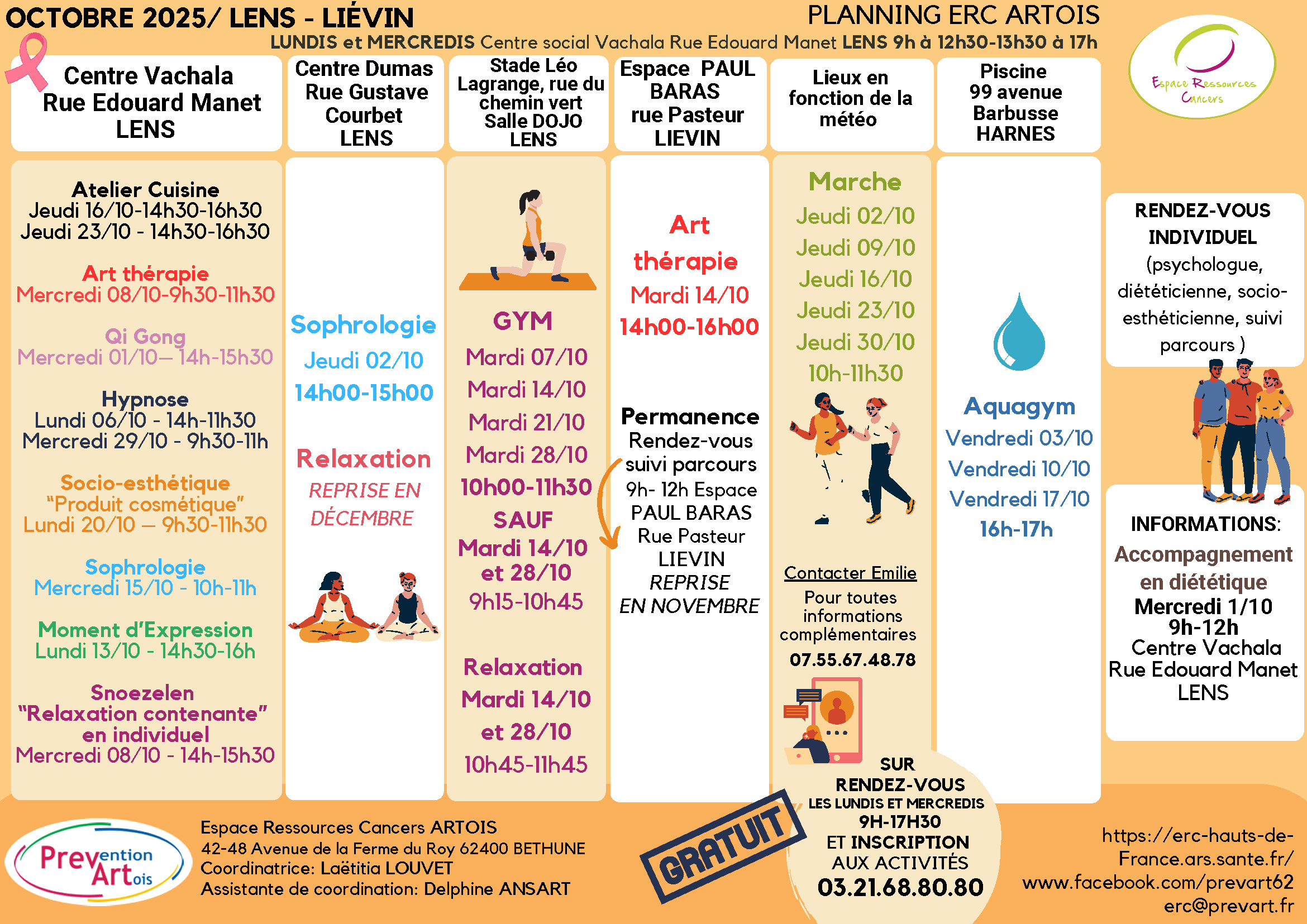 Découvrez le programme de octobre 2025 proposé par Prévention Artois Prevart dans les Espaces Ressources Cancers (ERC) d’Hénin-Beaumont, Béthune et Lens !