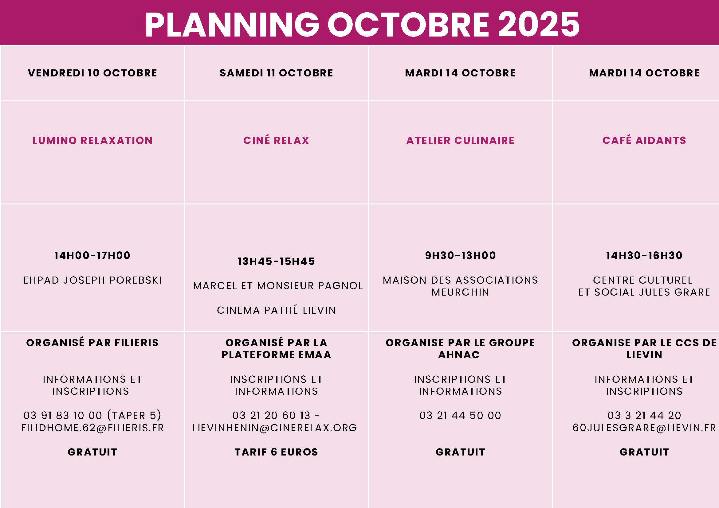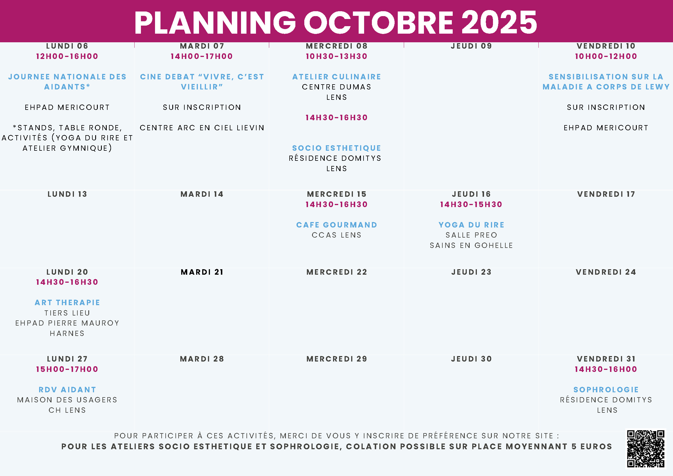 Chaque mois, la Plateforme d’Accompagnement et de Répit Lens-Liévin propose des activités spécialement dédiées aux proches aidants. Nous avons le plaisir de partager avec vous le planning d’octobre 2025.